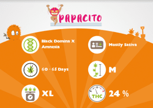 Vu le succès de notre Mamacita, nous avons décidé de faire une variation sur le même thème. Croisement entre notre Amnesia Haze et notre super star Black Domina, la plante est très productive avec une taille moyenne et une grosse concentration de fleurs sur la sommité principale. Ses fleurs sont denses et couvertes de cristaux, son odeurs hazy avec une pointe de musque donnée par son parent Black Domina.